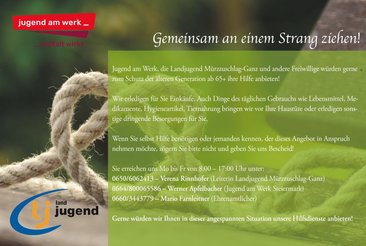 Gemeinsam mit Jugend am Werk hat die Ortsgruppe Mürzzuschlag-Ganz das Projekt „Nachbarschaftshilfe in Mürzzuschlag“ auf die Beine gestellt. Hier wird älteren Personen und auch jenen, die als Risikogruppe gelten, geholfen! Die Jugendlichen nehmen sich die Zeit für Einkäufe, Apothekengänge sowie etwaige Telefon-Tratscherl mit der Bevölkerung Mürzzuschlags.