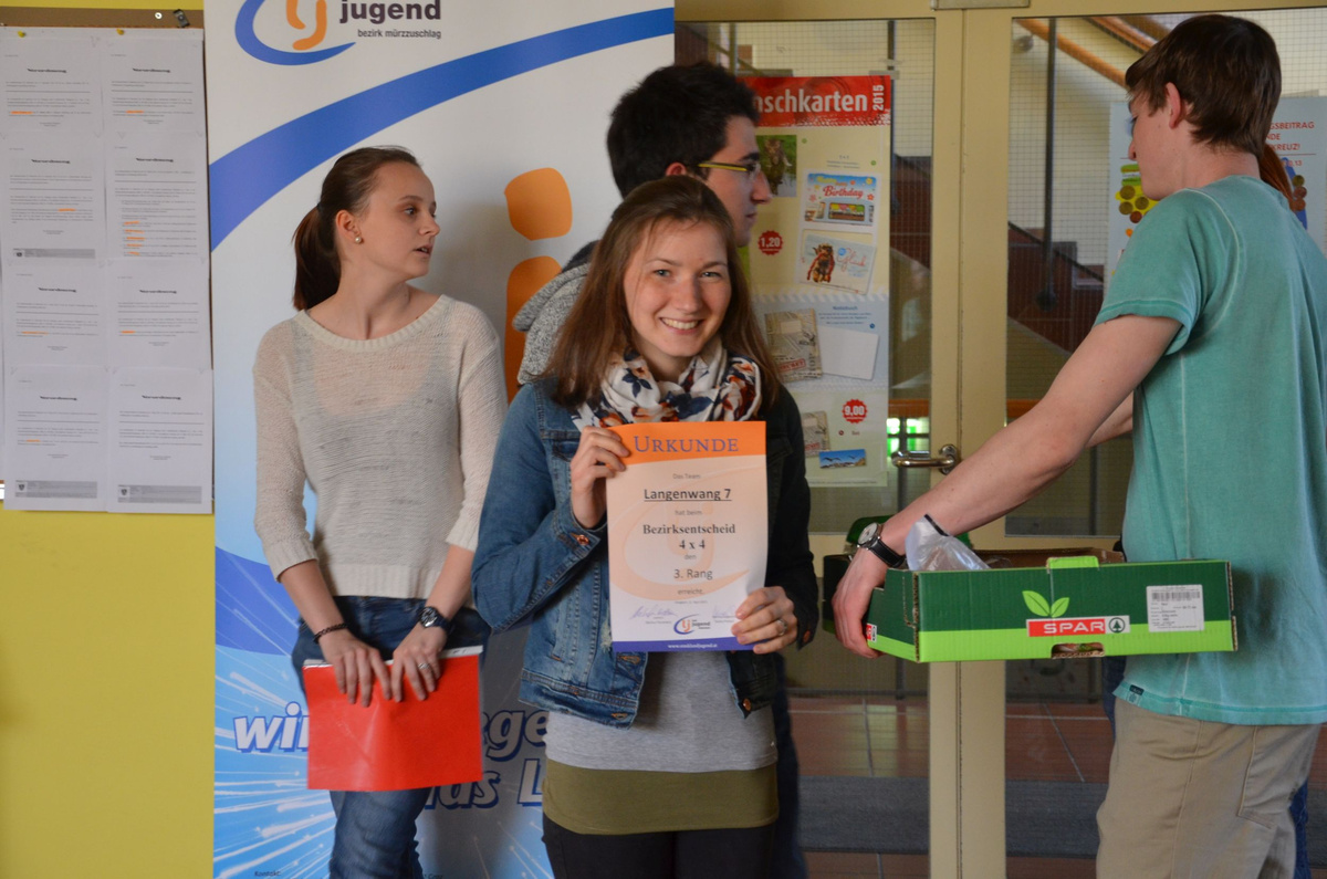 13 Teams nahmen am wunderschönen Samstagnachmittag beim 4x4 Bezirksentscheid in der HLW Krieglach teil. Die Teilnehmer mussten mit ihren Wissen über Afrika, Filmland Österreich, Neobiota, Genussregionen, Wahlen, die EU, Boden und Jugend im ländlichen Raum punkten. Berichte zu diesen Themen standen wie jedes Jahr in der Landeszeitung. Außerdem gab es noch eine Station zur Allgemeinbildung und Geschicklichkeit. Erster wurde das Team Krieglach 1 (Patrick Reiterer, Christine Rothwangl, Robert Thonhofer, Andrea Holzer-Rosenmayer) vor Afewerki (Nina Partlic, Christoph Jell, Patrick Hirschler, Katrin Schweighofer). Dritter wurde Langenwang 7 (Hannes Apfelbacher, Katharina & Christian & Mathias Rinnhofer).