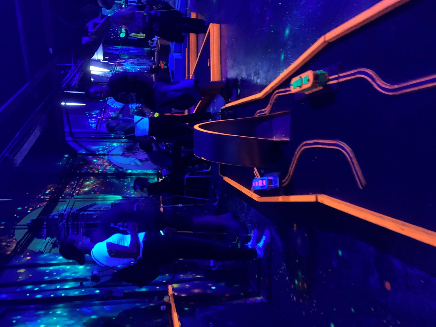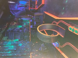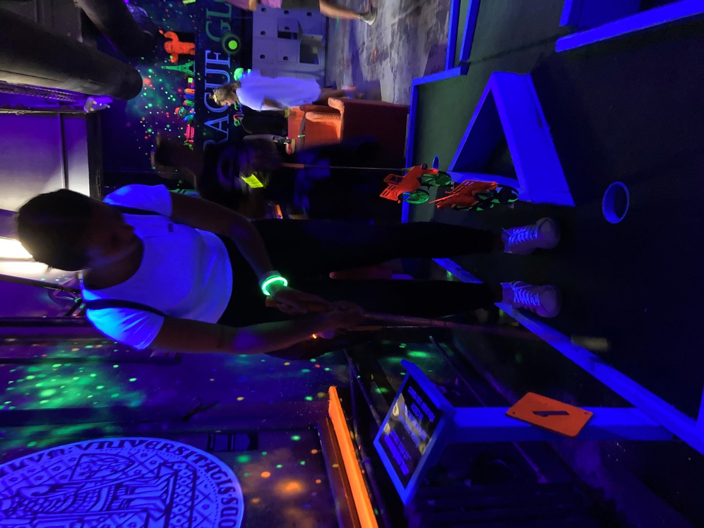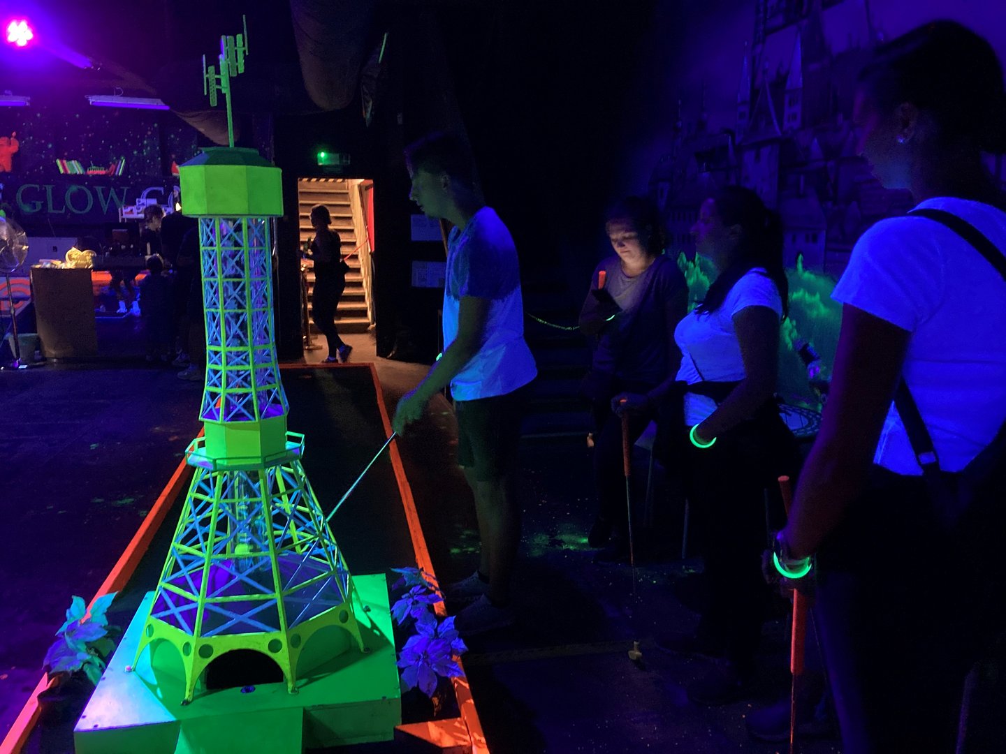 Daraufhin spielten wir Schwarzlicht Minigolf mit verschiedensten Hindernissen.