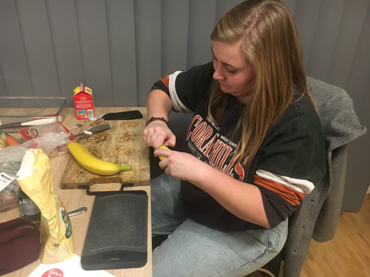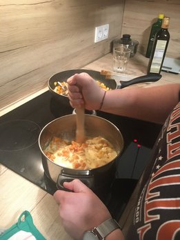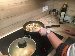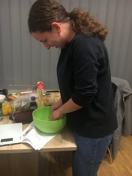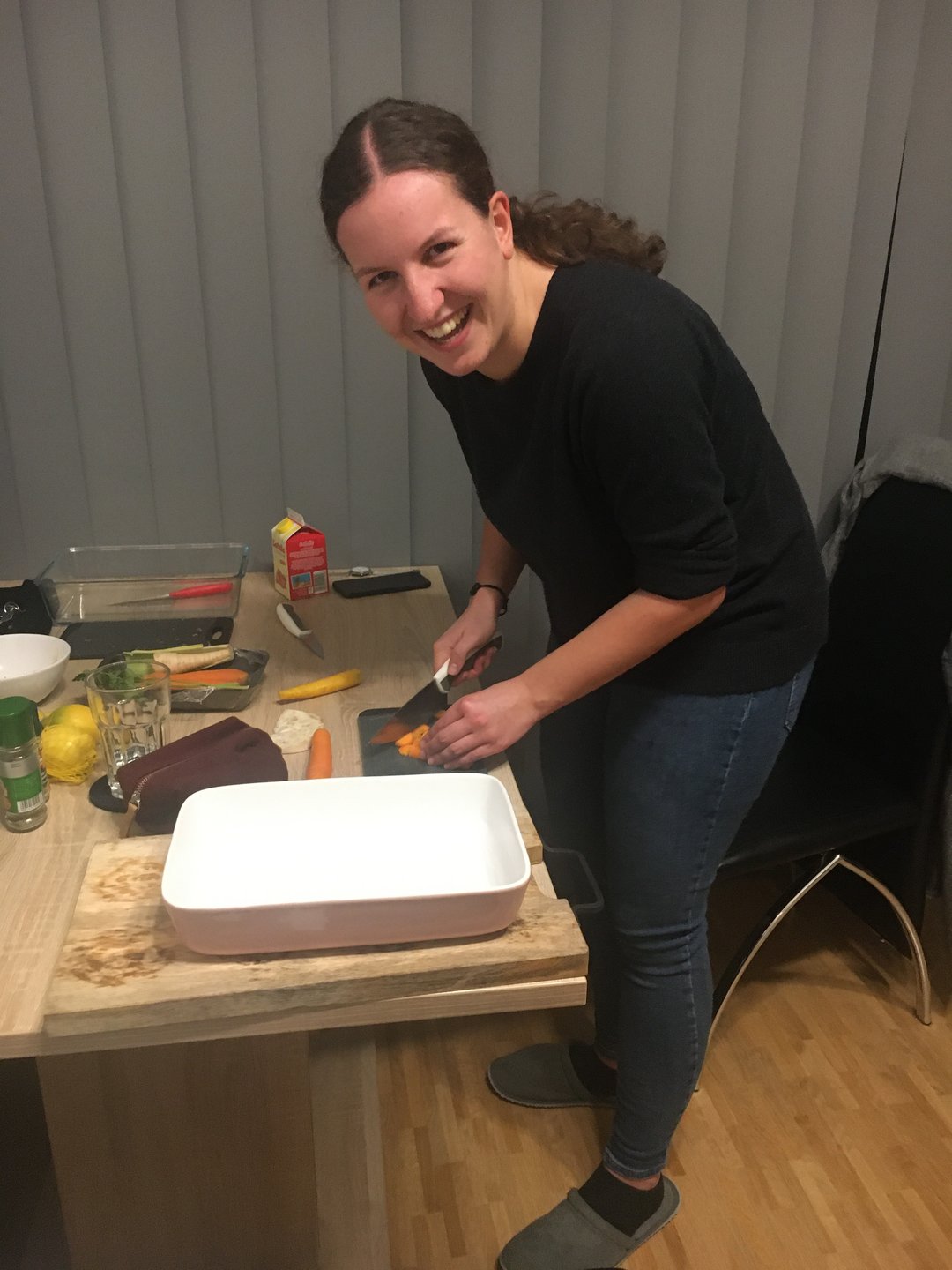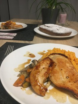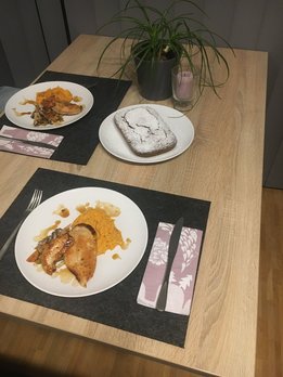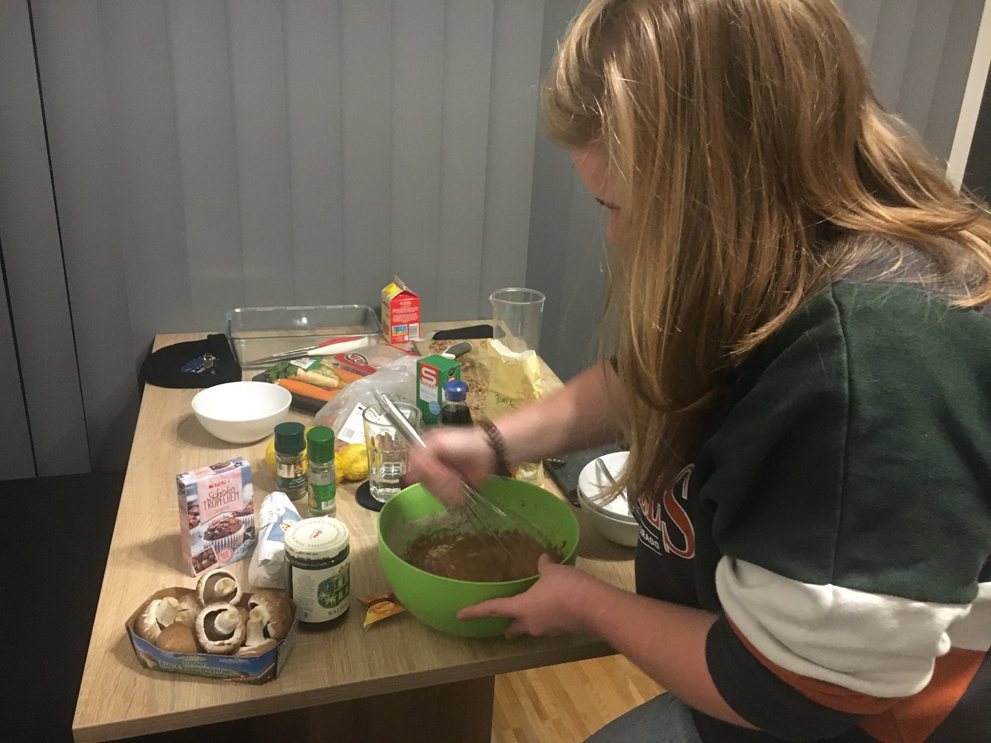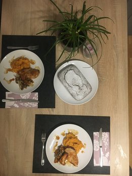 Nach zwei Stunden ging’s zum gemütlichen Teil über. Wir konnten unser selbstzubereitetes Menü, welches aus einem Honig-Zitronen-Hühnchen und einem Schoko-Bananen-Kuchen bestand, in vollen Zügen genießen.