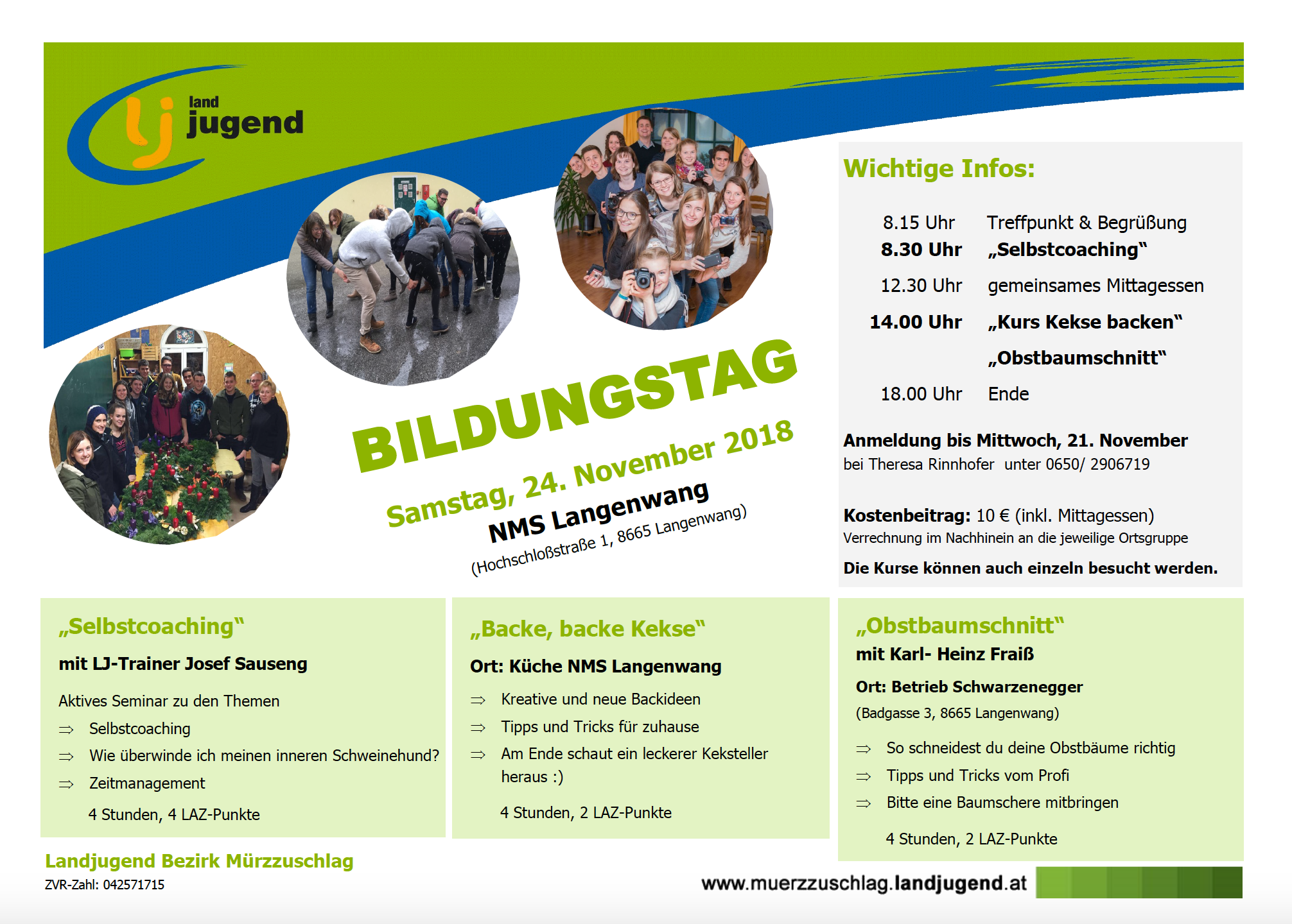 Nicht vergessen! Am 24. November findet der Bildungstag des Bezirks Mürzzuschlag statt! Fun, Action und viel Neues könnt ihr bei unseren diesjährigen Kursen erleben! Am Vormittag steht der Kurs "Selbstcoaching" am Programm, wo ihr vieles über Zeitmanagement und euren inneren Schweinehund lernen könnt. Kreativität und Spaß stehen am Nachmittag im Vordergrund. Hier könnt ihr zwischen den Kursen "Backe, backe Kekse" und "Obstbaumschnitt" wählen! Ein Tag, den man auf keinen Fall verpassen sollte! Also, meldet euch noch schnell über eure Ortsgruppenleitung oder bei Theresa Rinnhofer (0650/2906719) an! Wir freuen uns auf euch!