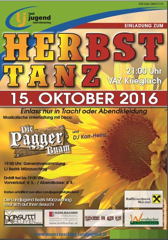 Am kommenden Samstag, dem 15. Oktober 2016 geht die 67. Generalversammlung mit anschließendem Herbsttanz über die Bühne. Die Highlights des Abends werden neben dem eindrucksvollen Tätigkeitsbericht und der Vorstellung des neuen Bezirksvorstandes auch die Verleihung der Leistungsabzeichen in Bronze und Silber an engagierte und motivierte LJ-Mitglieder sein. Dieses Jahr werden zwei Mitglieder unseres LJ-Bezirks eine besondere Auszeichnung erhalten: Das Zertifikat Ehren.Wert.Voll ist eine Auszeichnung des Landes Steiermark und wird an Jugendliche verliehen, die sich über die Maßen für die Interessen und Anliegen der Jugend im ländlichen Raum engagieren. Der anschließenden Herbsttanz wird mit einer schwungvollen Polonaise eröffnet. Für die musikalische Umrahmung sorgen im Saal "Die Paggerbuam", in der Disco sorgt DJ Karl-Heinz für Partystimmung. Kommt´s vorbei - Wir gfrein uns auf eich!