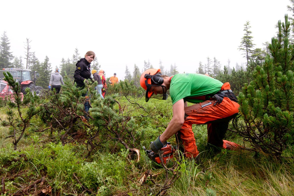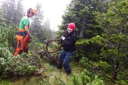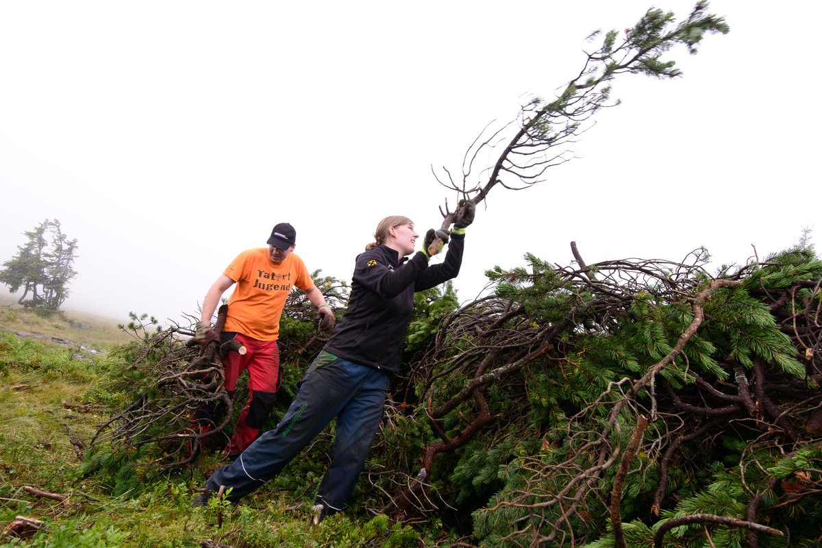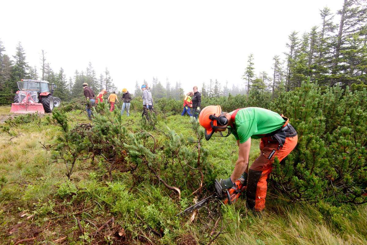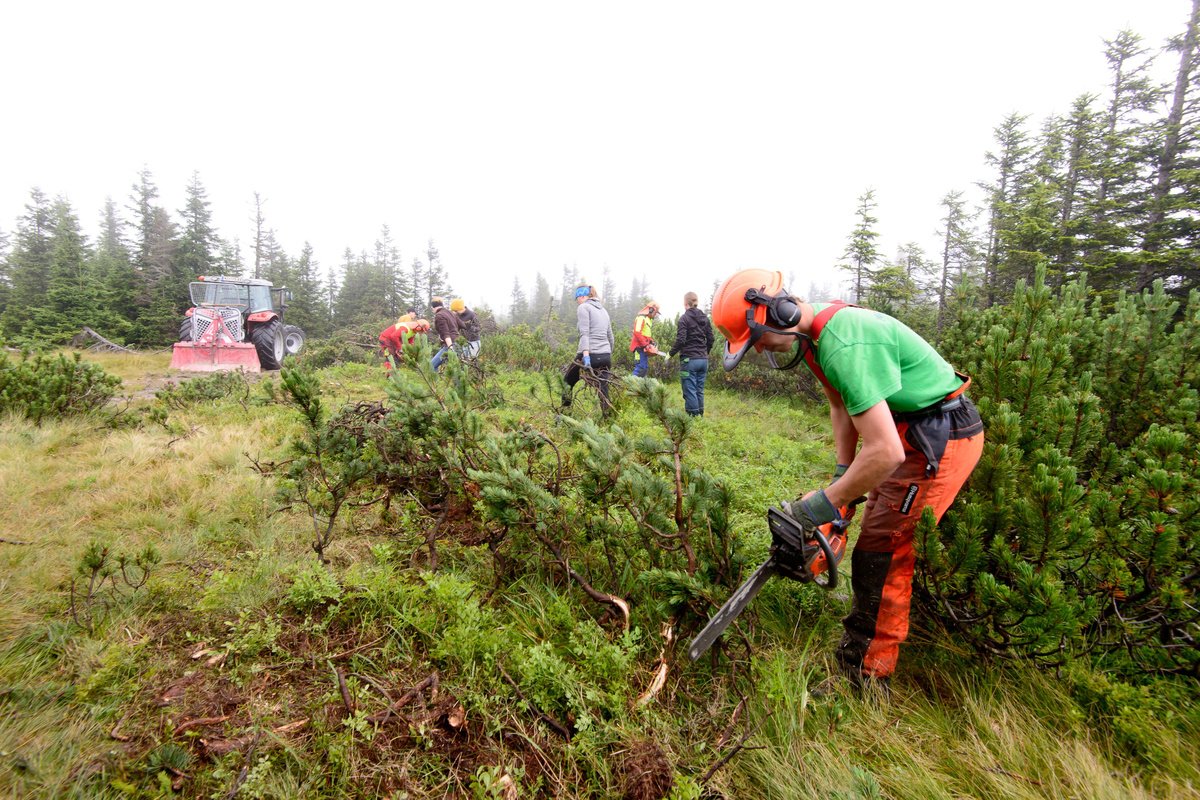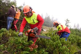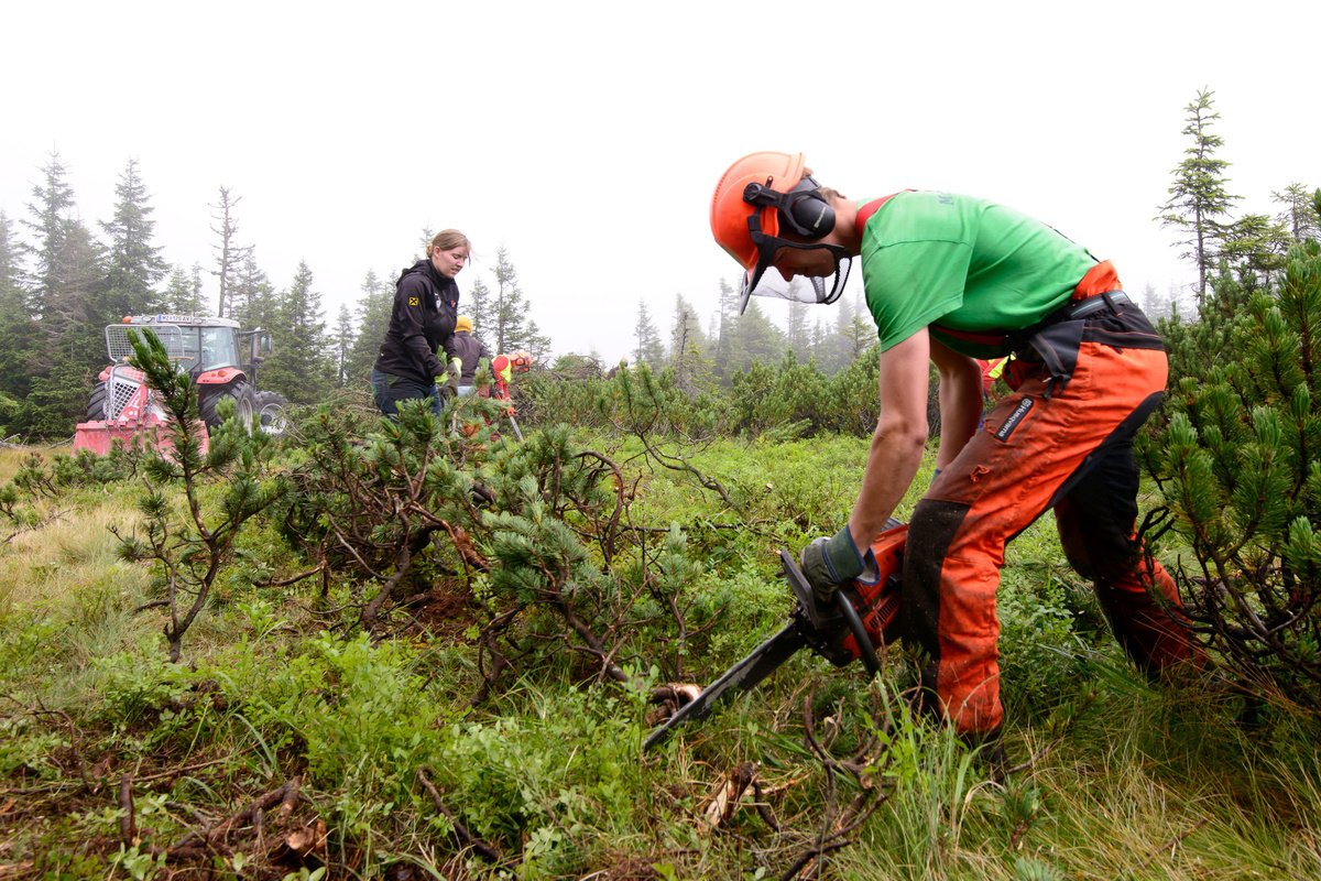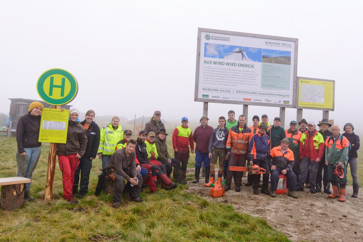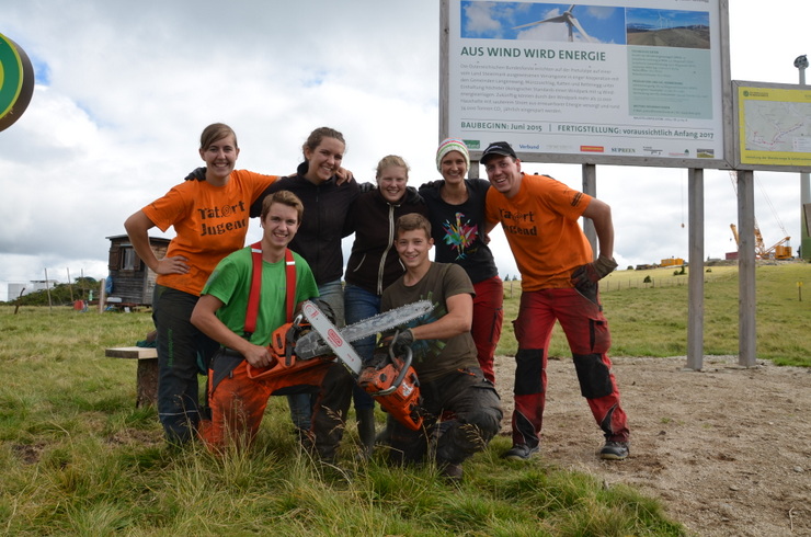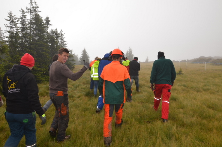 Im Rahmen von Tat.Ort Jugend haben wir uns dazu entschlossen, die Österreichischen Bundesforste bei der Renaturierung des Schwarzriegelmooses zu unterstützen. Begleitend zur Errichtung des Windparkes auf der Pretul, müssen ökologische Maßnahmen gesetzt werden, um die Tier-und Pflanzenvielfalt zu erhalten. Deshalb werden auf unterschiedlichen Flächen im Umkreis des Projektgebietes Waldverbesserungsmaßnahmen gesetzt, unter anderem soll der Bewuchs von moorfeindlichen Bäumen und Sträuchern reduziert werden. Daher machten sich 15 Mitglieder, sowie die Österreichischen Bundesforste und die Bergwacht am 13. August an die Arbeit. Auf 10 Flächen wurden bis zu acht Meter hohe Fichten mit der Motorsäge umgeschnitten, händisch oder per Seilwinde aus dem Moor gezogen und mittels Traktor abtransportiert. Stellenweise wurden auch Latschen und Zwergsträucher zurückgeschnitten, um den Feuchtigkeitshaushalt des Moores besser zu regulieren. Durch diese Maßnahmen wird ein Sinken des Grundwasserspiegels und Austrocknen des Moores verhindert. Das Ökosystem wird somit langfristig stabilisiert. Um das sensible Moos nicht noch weiter zu zerstören, hatte das ohne großen Maschineneinsatz zu erfolgen und war daher mit großem Arbeitsaufwand verbunden. Gerade bei den größeren Bäumen packten die Mitglieder oft zusammen und an und zeigten das gemeinsam einiges schaffbar ist. Das Resultat nach einigen Stunden Arbeit kann sich auf alle Fälle sehen lassen. Auch wenn der Tag sehr nebelig und kühl startete, kam bis zum späten Nachmittag sogar die Sonne hervor, genau passend für einen gemeinsamen Abschluss und um die Windräder einmal von der Nähe betrachten zu können. Um gleichzeitig einen sozialen Beitrag zu leisten, soll ein erheblicher Teil der Entschädigung, welche wir für die Arbeitsstunden erhalten, dem Dr. Karl Schwer Fonds zugutekommen. Die Spendenübergabe wird anlässlich unserer Generalversammlung am 15.Oktober stattfinden. Ein Dank gilt an dieser Stelle den 15 Mitgliedern die uns an diesem Tag, trotz des eher kühlen Wetters, unterstützt haben. Ihr habt uns gezeigt, was es heißt gemeinsam anzupacken und dabei auch eine Menge Spaß zu haben.