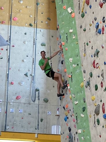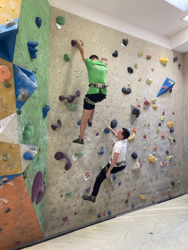 Danach brachen wir auf und fuhren in die Kletterhalle in der wir bouldern gingen. Später probierten wir auch mit dem Kletterseil und Klettergurt die hohe Wand zu besiegen.